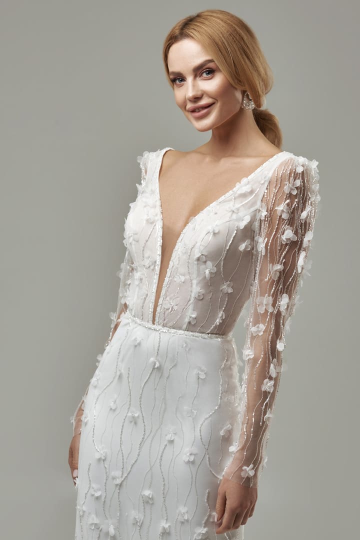 Kein Muster hat so viele Auftritte wie die Blume. Brautkleider mit dreidimensionalen Blumen in Spitze sind angesagter denn je. Sie unterstreichen das Erscheinungsbild und verleihen einen verspielten Touch.