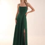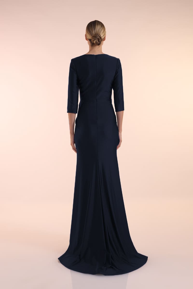 Elegantes Abendkleid mit einem Glitter Mesh Stoff (Glitzerstoff) in schwarz. Das Kleid hat einen V-Ausschnitt und 3/4-Ärmel. Es ist figurbetont und hat Drapierungen in der Taille. Der Beinschlitz ist ein weiters Highlight bei diesem zeitlosen Abendkleider Look.
