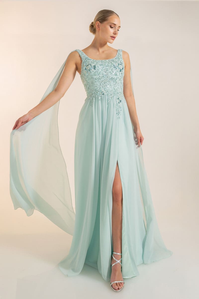 Romantisches Abendkleid mit einem weiten Chiffonrock mit Beinschlitz in der Farbe light mint. Das spitzenverzierte Oberteil ist mit vielen Glitzersteinchen verziert. Die raffinierten Chiffonschals bei den Trägern geben ein elegantes Aussehen.