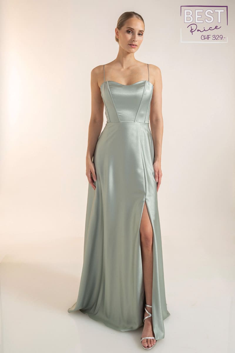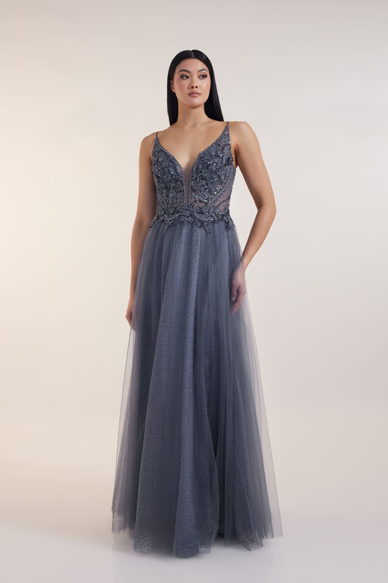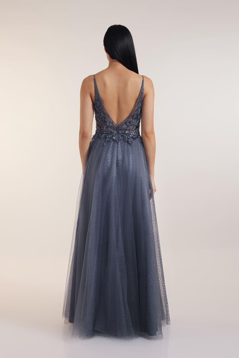 Atemberaubendes A-Linie Abendkleid mit einem Tüllrock aus Glitter-Mesh in der Farbe grau mit einer funkelnden Verzierung. Das spitzenverzierte Oberteil hat dünne Träger. Der tiefe V-Ausschnitt am Rücken ist ein weiteres Highlight bei diesem Abendkleid Outfit.