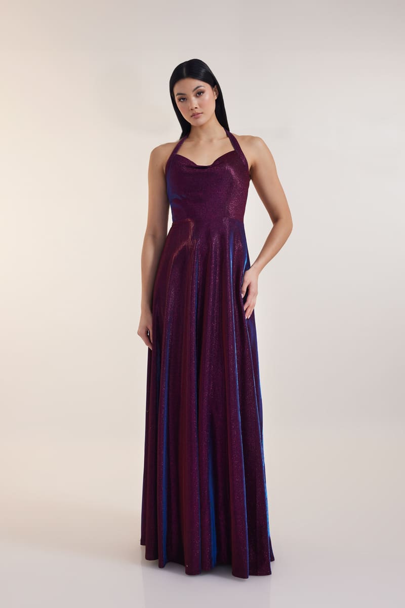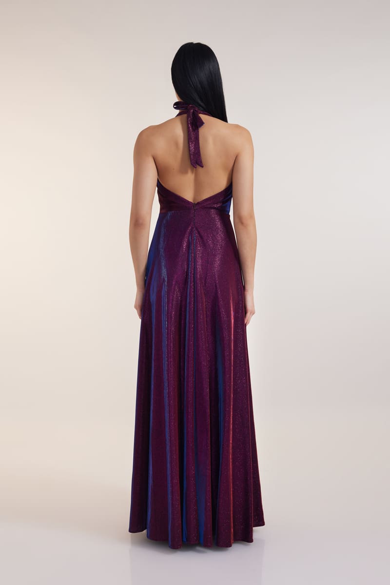 Romantisches Abendkleid in rot mit einem Glitter Mesh Stoff (Glitzerstoff). Das schlichte Abendkleid mit Neckholder hat einen tiefen Rückenausschnitt. Der Rock ist weit und leicht fliessend. Die wattierten Cups geben einen guten Halt.