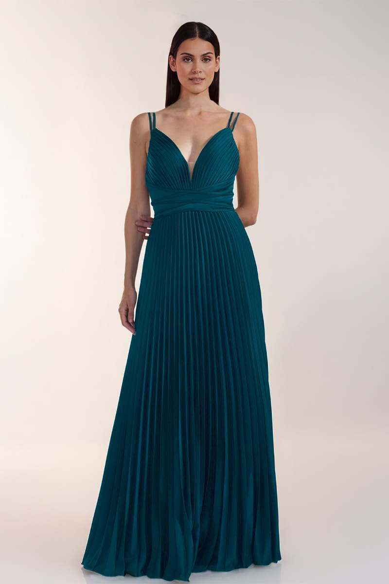 Auffallendes Abendkleid mit Spaghetti Trägern aus Metallic Stoff in der Farbe petrol. Das Abendkleid hat einen plissierten weiten Rock. Verleihe deinem Look mit dem Abendkleid 19253-0120 teal petrol einen Hauch von Eleganz und Stil für besondere Momente.