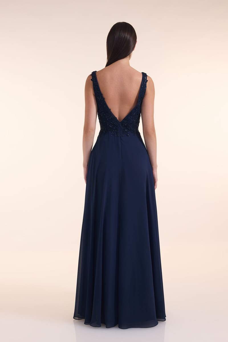 Elegantes Abendkleid in der Farbe navy. Das Oberteil hat einen V-Ausschnitt vorne und hinten. Es ist mit vielen Glitzerapplikationen verziert. Die Träger geben eine gute Passform. Der leicht fallende Chiffonrock mit Beinschlitz schmeichelt jeder Figur.