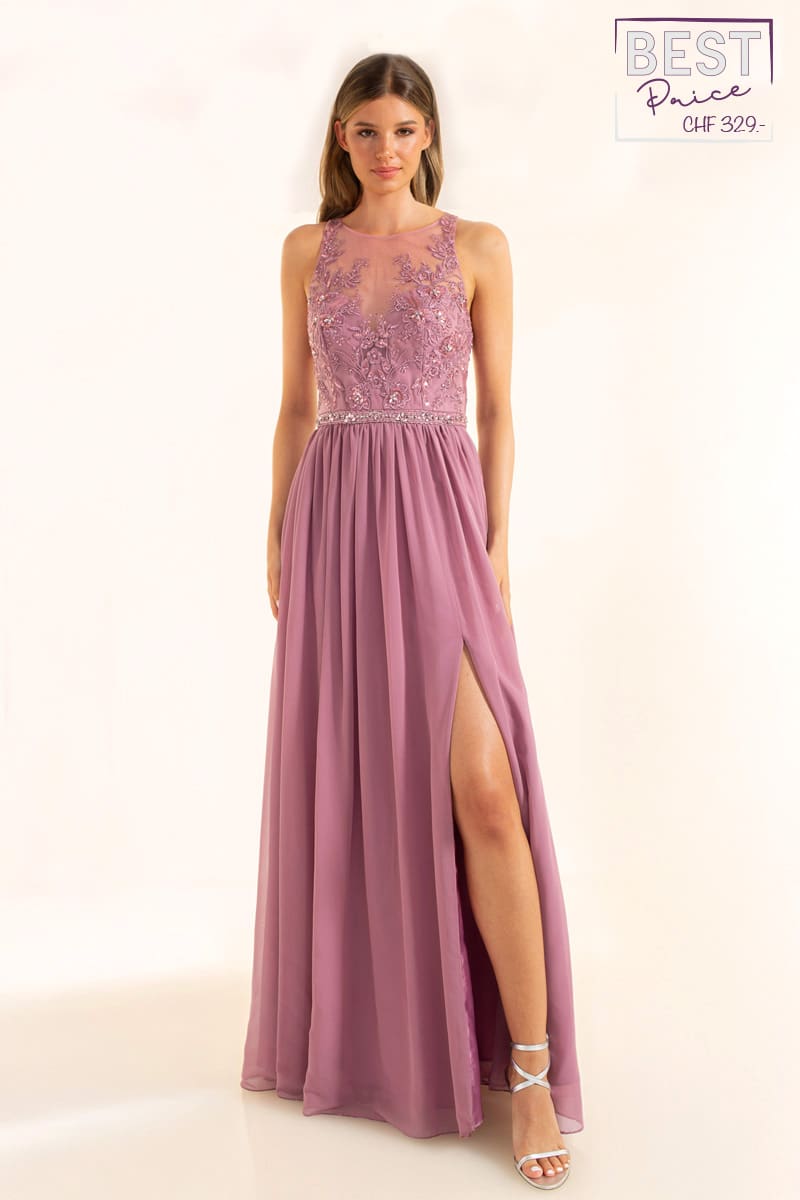Elegantes Abendkleid in der Farbe berry. Das Oberteil mit den Spaghettiträgern hat ein auffallendes Spitzenoberteil, welches verziert ist mit vielen Glitzersteinchen und Pailletten. Der weite Satinrock zaubert einen eleganten Look. Ein tolles Abendkleid und für jede Figur geeignet. Verleihe deinem Auftritt Glanz und Glamour mit diesem Abendkleid in berry.
