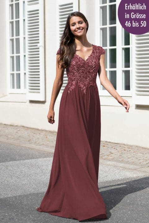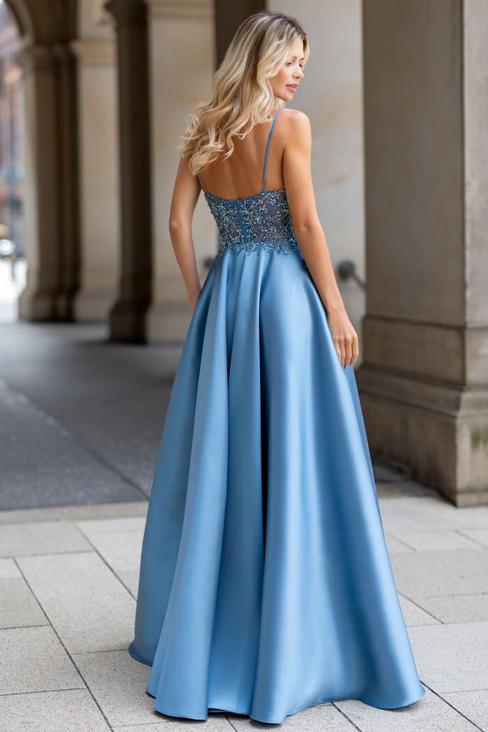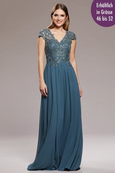 Elegantes Abendkleid für grosse Grössen in Alaska blue. Das spitzenbesetzte Oberteil mit Spaghettiträgern ist mit unzähligen Glitzerapplikationen verziert. Der weite Satinrock ausgestattet mit Taschen schmeichelt jeder Figur.