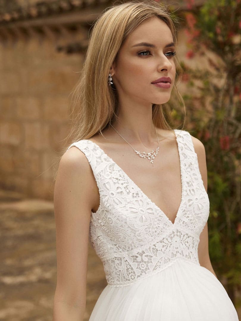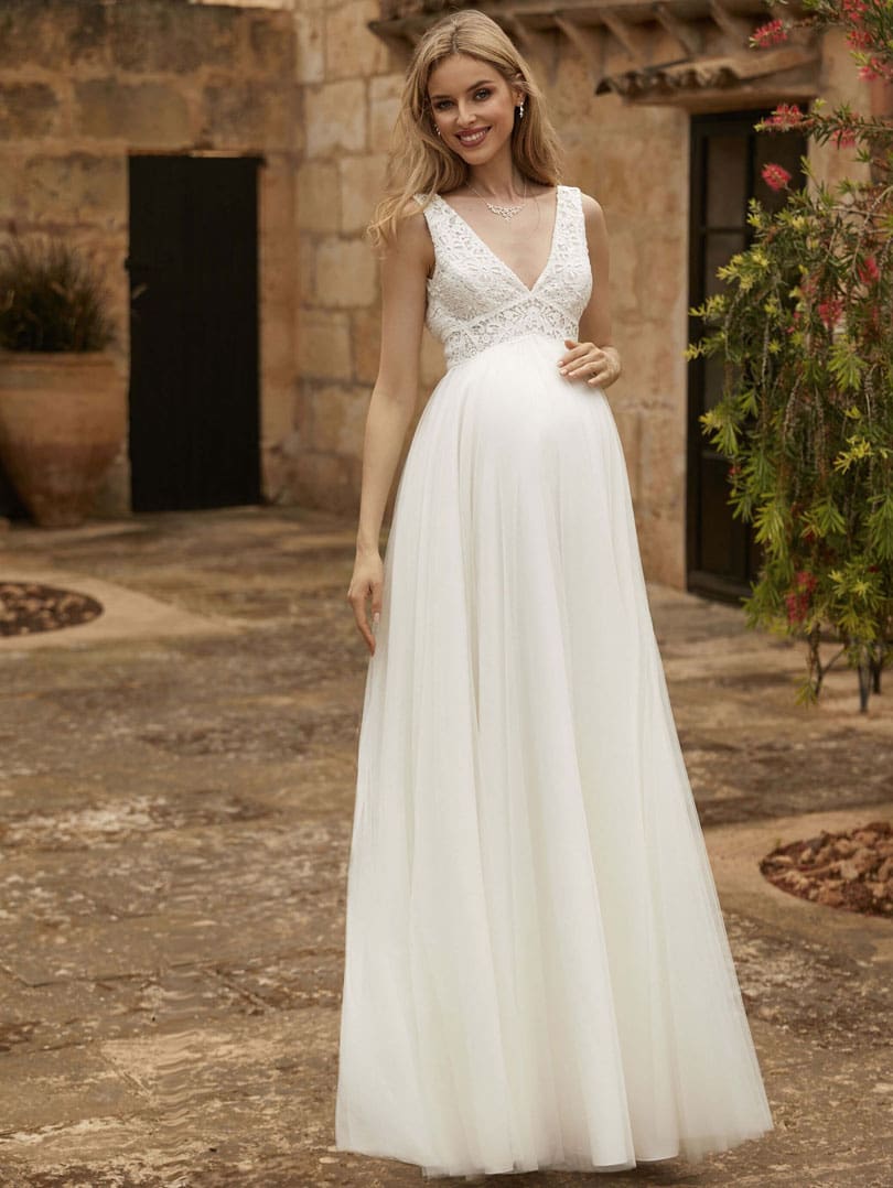 Alexa ist ein romantisches Umstandsbrautkleid aus Spitze und Tüll. Dieses atemberaubende Umstandsbrautkleid setzt mit seinem verführerischen V-Ausschnitt auf beiden Seiten ein zeitloses Modestatement und lässt den Babybauch bezaubernd aussehen.