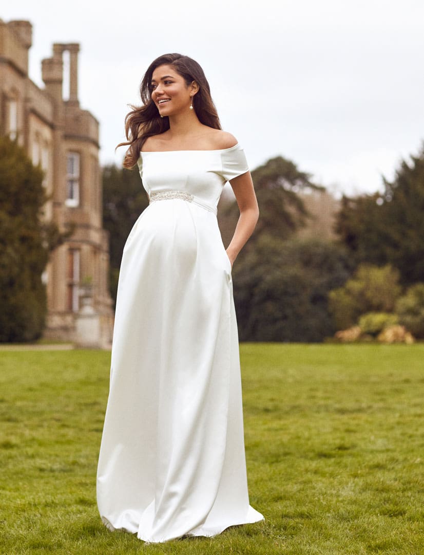 Das Umstandsbrautkleid Aria mit einem matt glänzenden Stoff verleiht viel Glamour und zaubert eine wahrhaft zeitlose Ausstrahlung. Das Umstandsbrautkleid ist schulterfrei und schmeichelt jeder Figur. Mit den verdeckten Seitentaschen und den Falten über dem Bauch zaubert dieses Kleid einen eleganten Look. Optional kann das Kleid mit einem Glitzergürtel oder schlichten Satingürtel getragen werden.