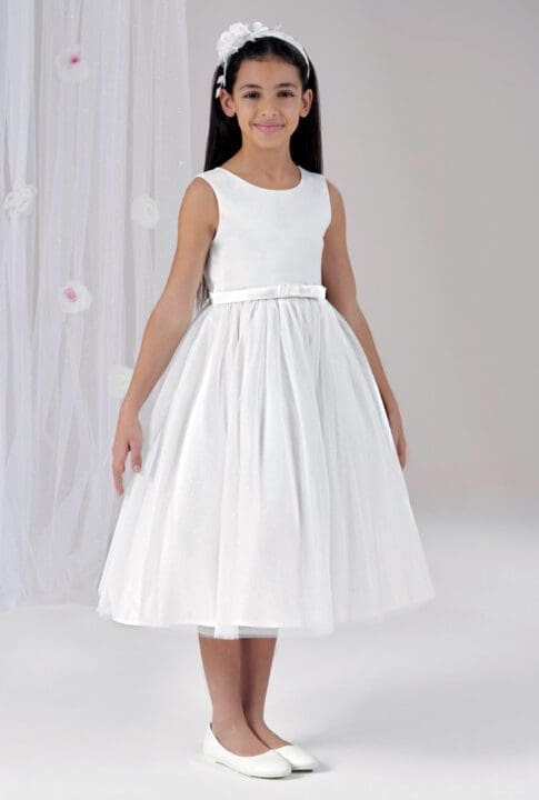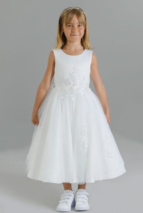 Romantisches Blumenmädchenkleid mit weitem Tüllrock, verziert mit Stoffblumen. Das Oberteil ist aus Satin. Der Gürtel mit der grossen Masche zaubert ein traumhaft schönes Aussehen. Ein richtiges Prinzessinenkleid für besondere Anlässe.