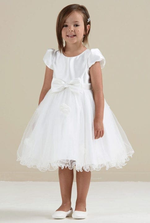 Das Blumenmädchenkleid Marleen hat einen wunderschönen langen Glitzertüllrock in rosé. Das spitzenverzierte Oberteil ist in ivory gehalten und setzt wunderschöne Akzente. Der Rücken wird mit einem Gürtel aus Tüll gebunden.
