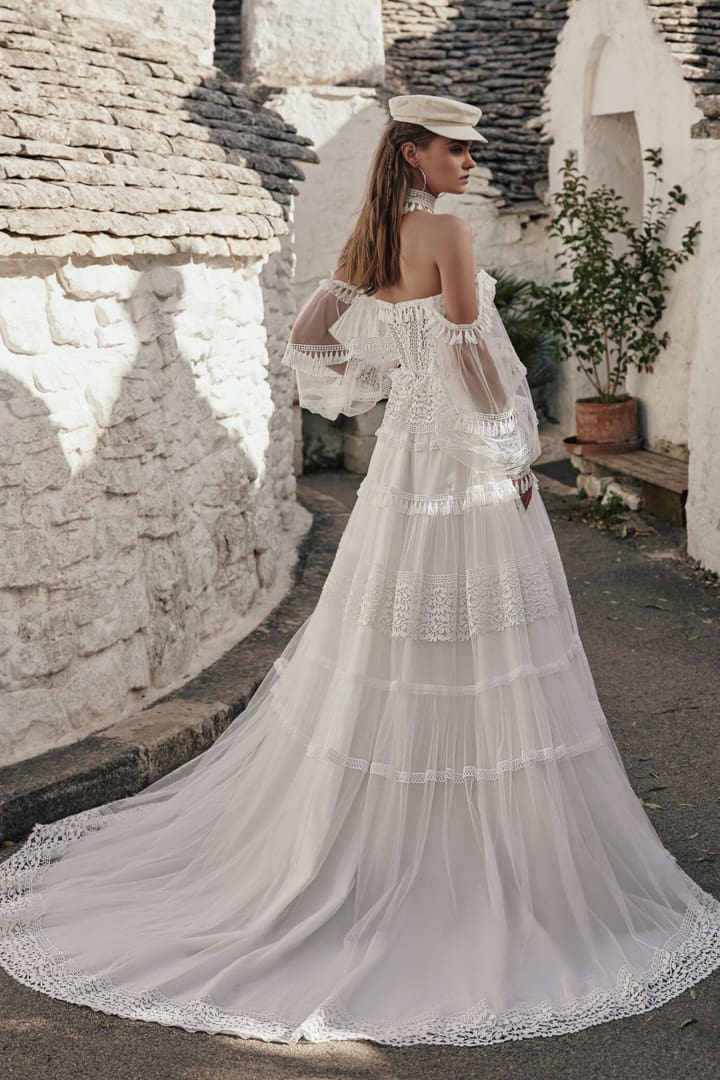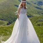 Auffallendes Boho Hippie Brautkleid mit einer aufwendig verzierten Spitzenapplikation im Oberteil und im Tüllrock. Das Oberteil hat eine klassische Korsagenform. Die weiten Tüllärmelchen zaubern einen romantischen Look. Mit dem tollen Halsschmuck wird der Boho Look ergänzt.