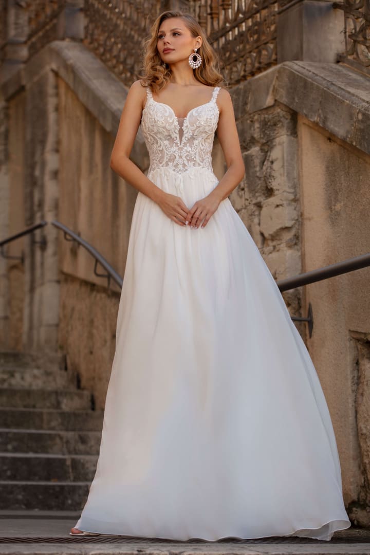 Romantisches A-Linie Brautkleid mit einer wunderschönen Spitze. Das Oberteil ist mit schmalen Trägern und einem V-Ausschnitt ausgestattet. Der tiefe Rückenausschnitt lässt alle Blicke auf sich werfen. Ein weiteres Highlight ist die lange Schleppe mit dem einem Spitzenabschluss. Ein traumhaftes Design für einen unvergesslichen Auftritt an deinem Hochzeitstag.