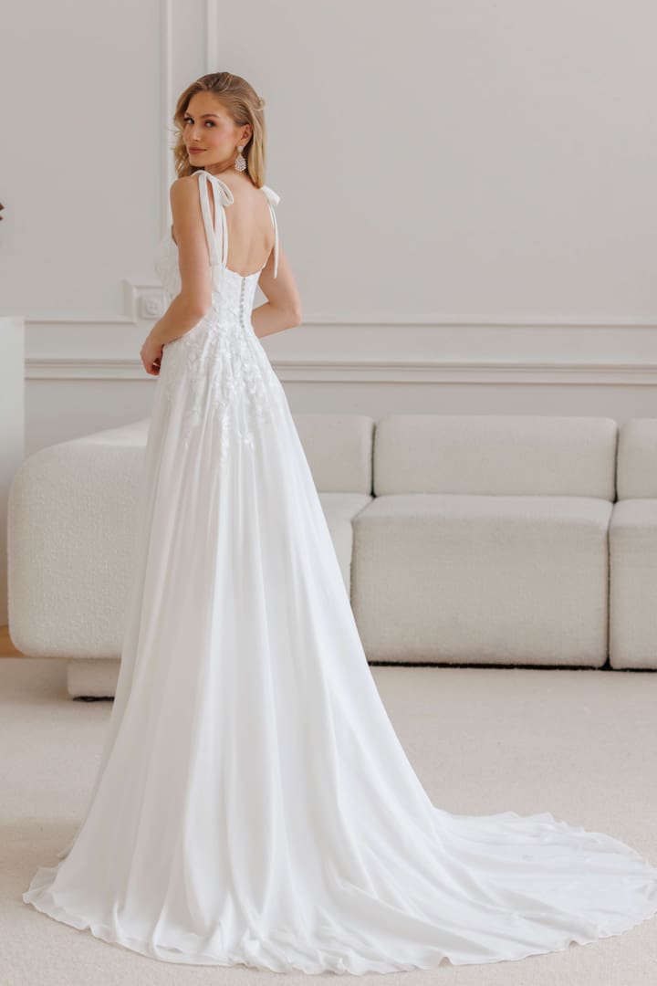 Elegantes A-Linie Brautkleid mit einem leicht fallenden Chiffonrock mit Beinschlitz (auch ohne Beinschlitz erhältlich). Das klassisch spitzenverzierte Oberteil ist mit einem Herzausschnitt ausgestattet. Die Spitze ist in den Rock appliziert. Die breiten Träger können mit ohne einer Schlaufe gebunden werden. Der Rücken ist mit satinierten Knöpfen verziert. Eine Schleppe rundet das schöne Design ab.