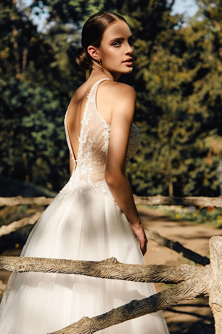 Atemberaubendes Brautkleid mit einem modernen transparenten Oberteil mit einer blumenverzierten Spitze und auffallenden Glitzerelementen. Das Brautkleid hat schmale Träger und einen tiefen V-Ausschnitt. Der weite Tüllrock zaubert einen Hauch von Romantik.