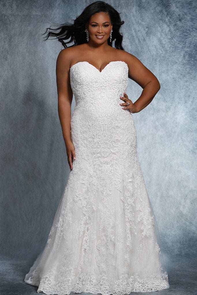Was für ein detailverliebtes Brautkleid aus Tüll mit einer anmutigen Spitzenapplikation und transparenten Pailletten. Das enge Kleid ist mit einem Herzausschnitt ausgestattet und mit einer Schnürung versehen. Es zaubert aus deinen Kurven eine atemberaubende Figur.