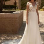Aspasia ist ein bezauberndes Brautkleid aus Spitze und weichem Tüll. Das romantische Kleid verfügt über eine lange Schleppe, einen V-Ausschnitt und einen V-Rücken. Es betont die natürliche Taille und macht eine schmeichelhafte Silhouette. Das ärmellose Kleid zeigt Eleganz und ist mit moderner Blätter-Spitze verziert.