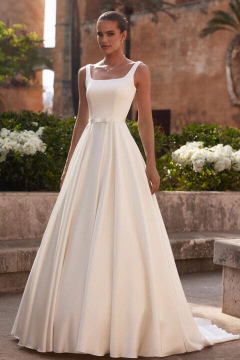 Brautkleid schlicht Brautmode schlicht Schlichtes Brautkleid mit geraden Ausschnitt Hochzeitskleid Clean Chic