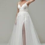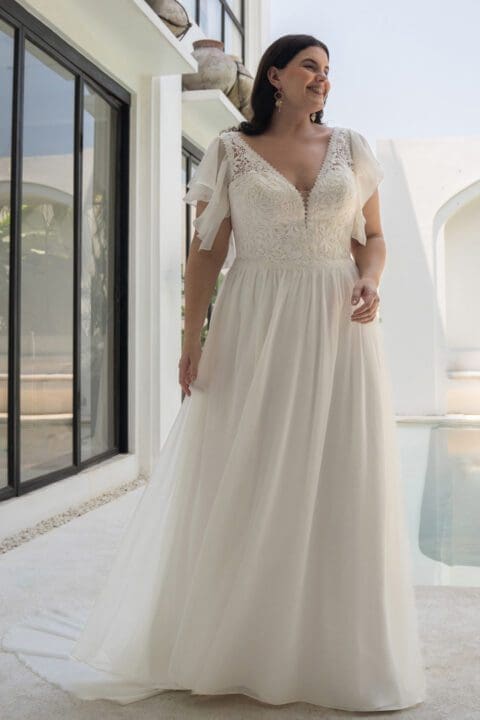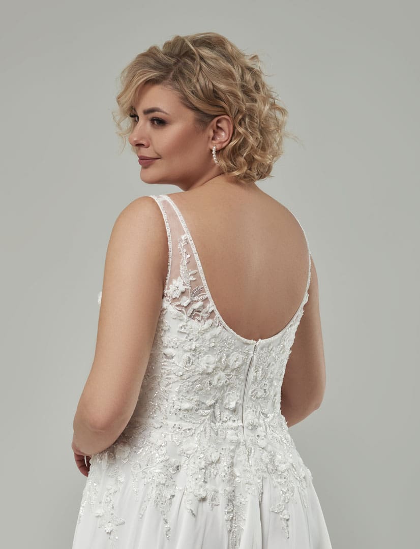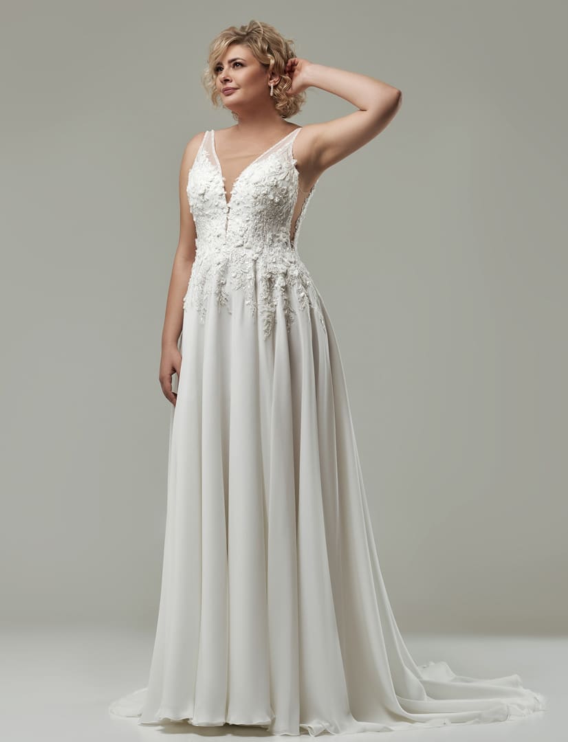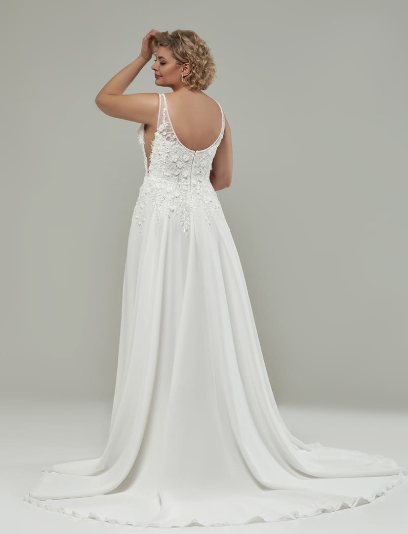 Elegantes Brautkleid für grosse Grössen mit einem leicht fallenden Chiffonrock und einer langen Schleppe. Das Oberteil ist mit dem tiefen V-Ausschnitt und dem seitlichen Cut out ein richtiger Hingucker. Die romantische 3D-Spitzenapplikation gibt dem Brautlook ein besonderes Aussehen, welche über Taille und Hüfte in unterschiedlichen Längen in den Rock hinein ausläuft. Das Oberteil glänzt dezent mit schimmernden Pailetten.