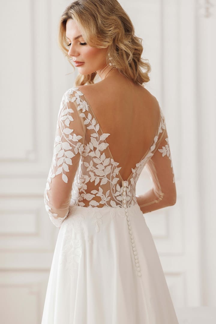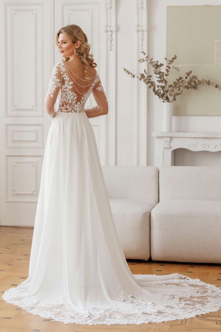 Romantisches Brautkleid mit langen Spitzenärmeln. Satinierte Knöpfe sind am Rücken appliziert. Die Schleppe ist mit einer Spitzenbordüre versehen. Das Brautkleid Devoni bietet zeitlose Schönheit und Raffinesse. Perfekt für Bräute, die ein unvergessliches Kleid suchen.