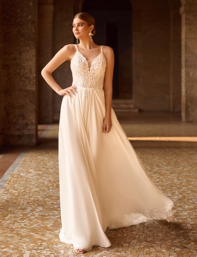 Klassik und Moderne vereint in diesem atemberaubenden Brautkleid Eda. Der leicht fallende Chiffonrock gibt ein elegantes Aussehen. Das Oberteil hat dünne Träger, die am Rücken in zwei Bahnen laufen. Das spitzenbesetzte Oberteil ist verziert mit Perlen und Strasssteinchen.