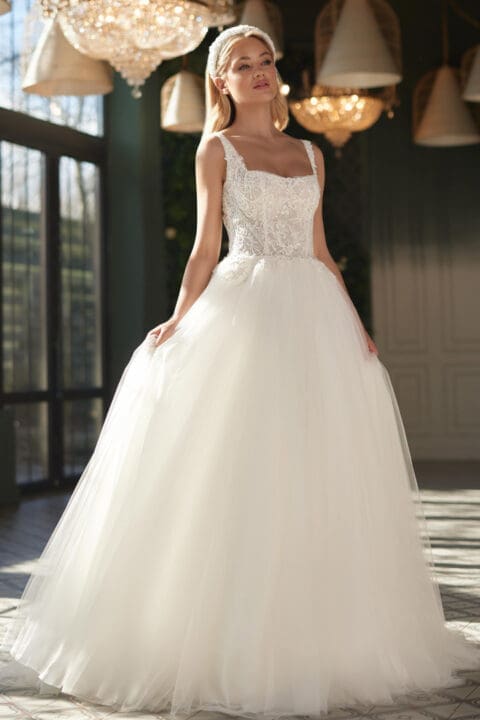 Romantisches Brautkleid mit einer Boho Spitzenapplikation. Der leichte Chiffonrock mit Schleppe schmeichelt jeder Figur. Das Oberteil hat lange Ärmel und einen tiefen V-Ausschnitt vorne. Am Rücken lässt sich das Kleid mit satinierten Knöpfen verschliessen.