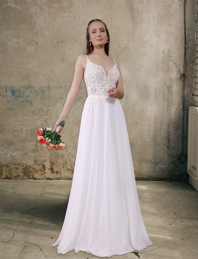 Elegantes Brautkleid mit Spaghettiträger und einem leicht fallenden Chiffonrock. Das transparente Oberteil ist mit einer wunderschönen Spitzenapplikation verziert. Der Rücken ist offen. Das Highlight bei diesem Brautkleid ist die spitzenverzierte Schleppe, die ein richtiger WOW-Moment zaubert.