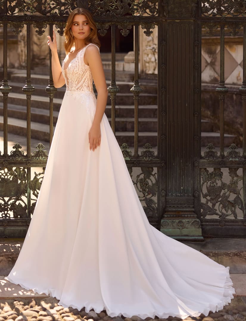 Ein Brautkleid mit dem gewissen Etwas. Das mit Blumen und Glitzersteinchen verzierte Oberteil hat einen tiefen V-Ausschnitt vorne und hinten. Die Spitze verläuft in den Rock. Der Rücken ist ein Hingucker der besonderen Art. Der Chiffonrock hat eine lange Schleppe.