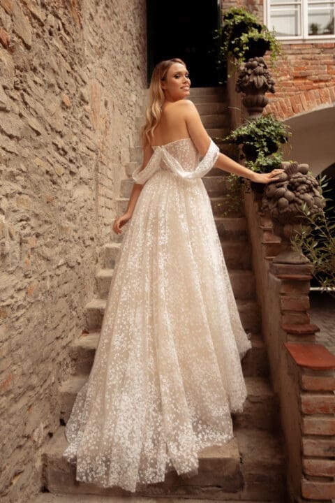 Brautkleid schlicht und elegant mit einem leicht fliessenden Chiffonrock. Das perlenverzierte Oberteil hat einen V-Ausschnitt vorne und hinten und seitliche Cut-Outs. Stil und zeitlose Schönheit wartet auf dich.