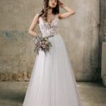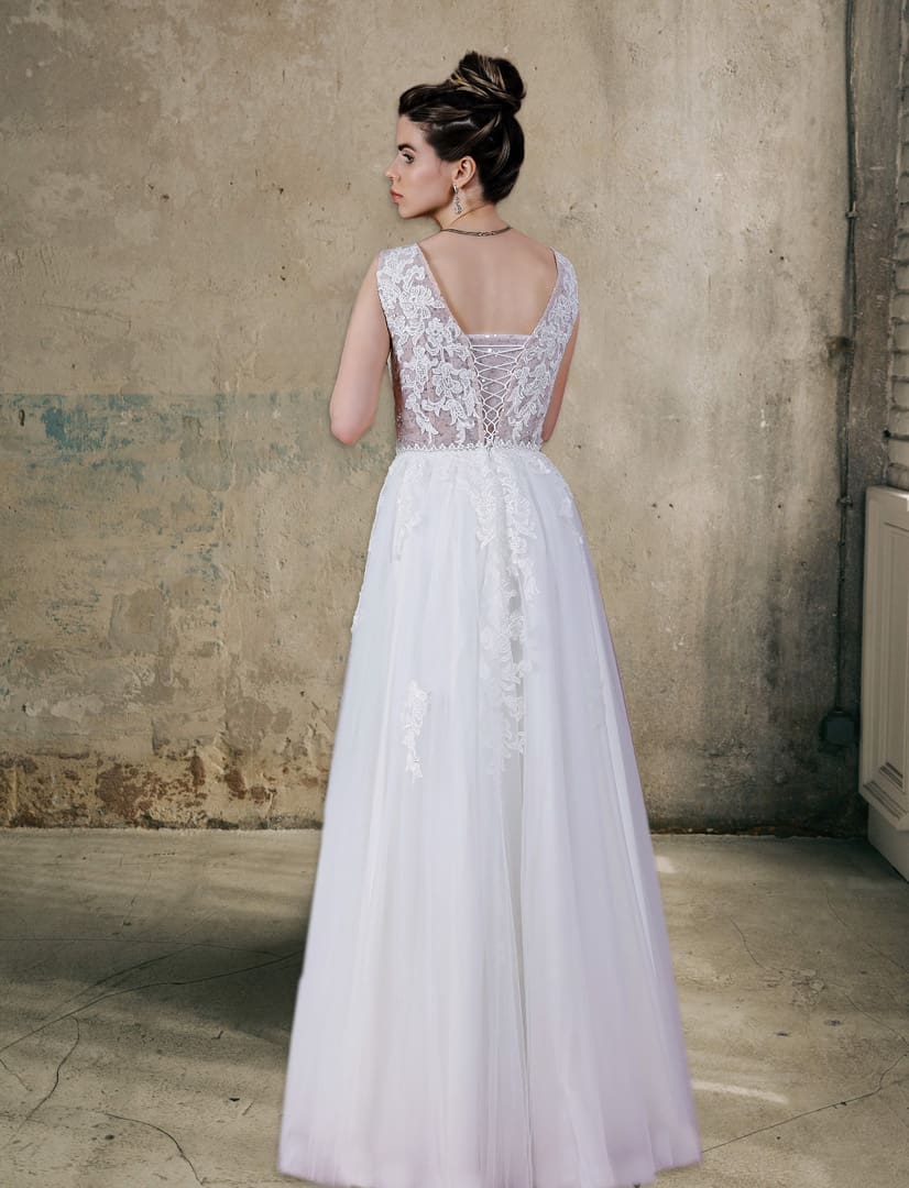 Wunderschönes Brautkleid mit einem spitzenbesetzten Tüllrock. Das Oberteil ist verziert mit vielen schimmernden Pailletten und einer romantischen Spitzenapplikation. Es hat breite Träger, die einen sicheren Halt geben. Am Rücken lässt sich das Kleid mit einer Schnürung verschliessen.
