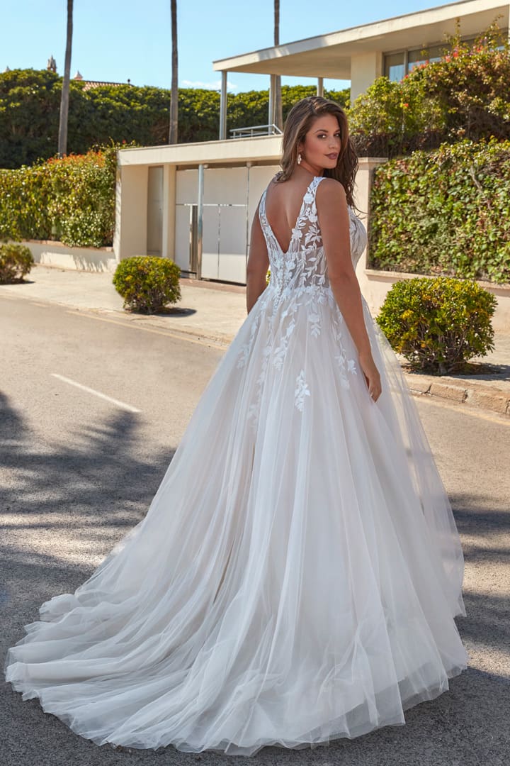 Wunderschönes Brautkleid für grosse Grössen mit einem blumenverzierten Design. Der Tüllrock hat eine Schleppe und ist mit einem Glitzertüll ausgestattet. Das transparente Oberteil aus Spitze lässt jede Plus Size Braut zauberhaft aussehen.