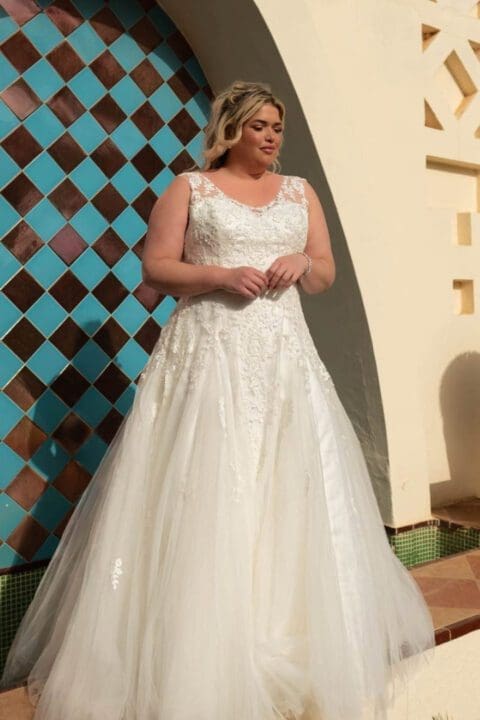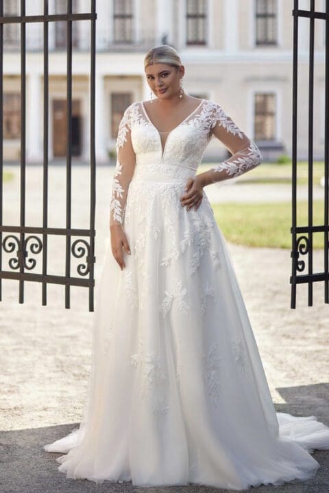 Romantisches Brautkleid für grosse Grössen aus Satin. Das Brautkleid mit der raffinierten Schnittführung schmeichelt jeder Plus Size Figur. Der Rücken ist offen und mit einer zarten Spitzenapplikation und Perlenknöpfe verziert. Die lange Schleppe ist ein weiteres Highlight bei diesem atemberaubenden Brautkleid.