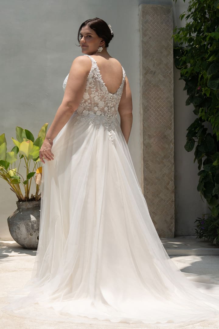 Traumhaft schönes Brautkleid für grosse Grössen mit einer romantischen Spitzenapplikation . Das Oberteil hat einen V-Ausschnitt vorne und hinten. Der Rücken ist transparent. Das Brautkleid hat einen Tüllrock mit einer Schleppe.