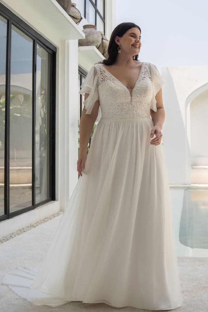 Romantisches Brautkleid für grosse Grössen in A-Linie gehalten mit einer Boho Spitze. Das Oberteil hat einen V-Ausschnitt und abnehmbaren Flatterärmeln. Das Brautkleid hat einen luftig leichten Chiffonrock mit einer Schleppe.