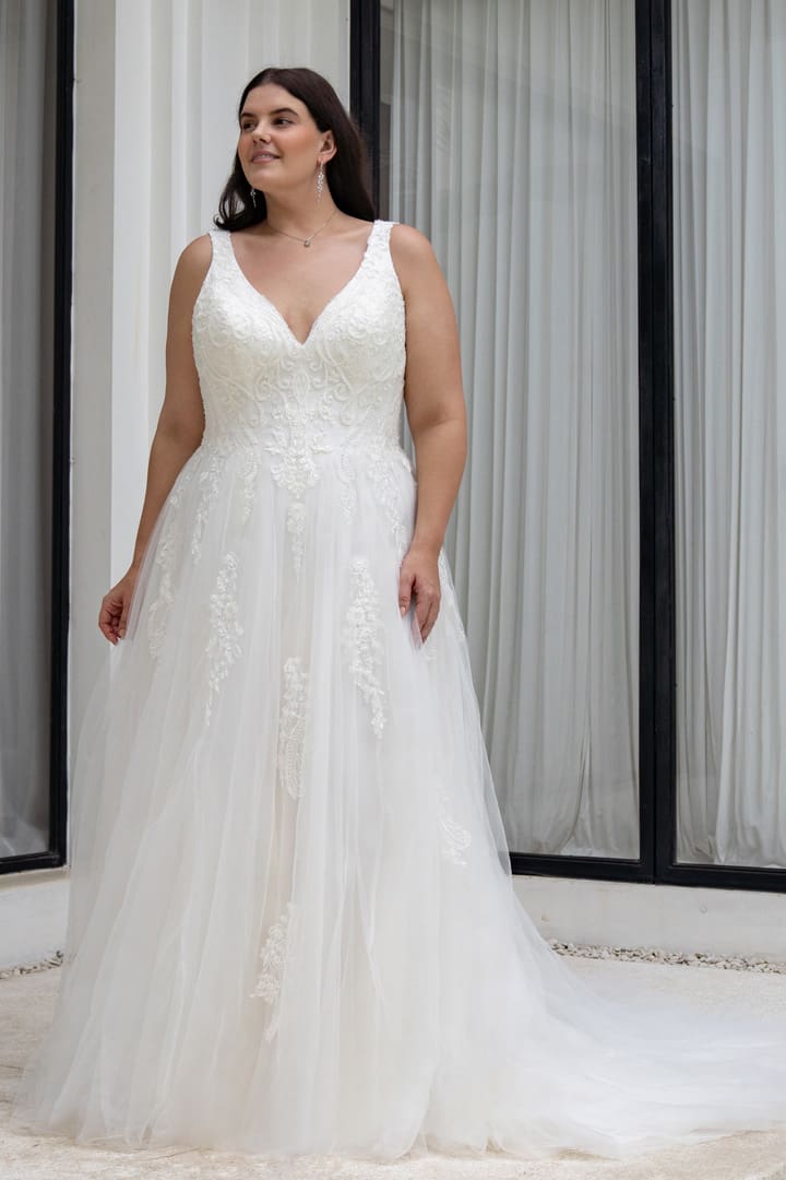 Romantisches Brautkleid für grosse Grössen in A-Linie gehalten. Das spitzenverzierte Oberteil hat breite Träger und einen V-Ausschnitt. Der Rücken ist transparent und mit feinen Träger appliziert. Der Tüllrock hat eine Schleppe und ist mit der Spitze verziert.