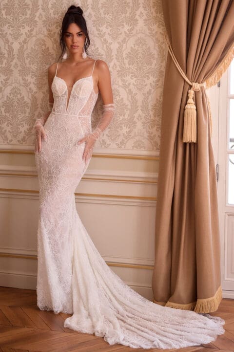 Romantisches A-Linie Brautkleid aus hochwertigem Chiffon und Spitze. Dieses atemberaubende Kleid verfügt über eine Illusionsschleppe und einen V-Rücken sowie einen V-Ausschnitt. Es betont eine natürliche Taille für eine schmeichelhafte Silhouette. Die floralen Spitzenapplikationen machen dieses ärmellose Kleid zu einem echten Hingucker.