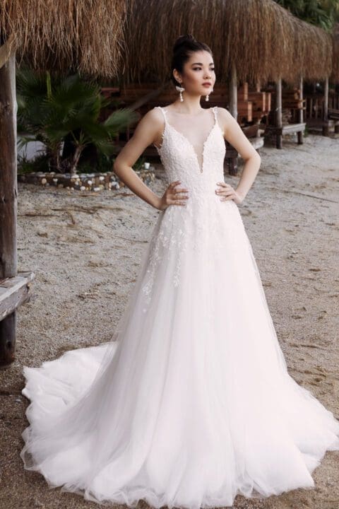 Prinzessinnen Brautkleid mit einem weiten Tüllrock mit einer Schleppe. Zahlreiche Glitzersteine zieren das Oberteil. Der Rock ist mit Glitzerbahnen verziert und gibt diesem Traumkleid aus Tüll ein besonderes Aussehen. Das Oberteil hat eine transparente Korsage und ist mit einer Schnürung ausgestattet. Optional auch erhältlich mit Träger.