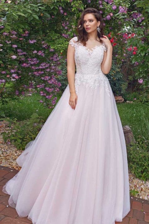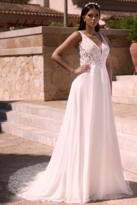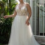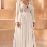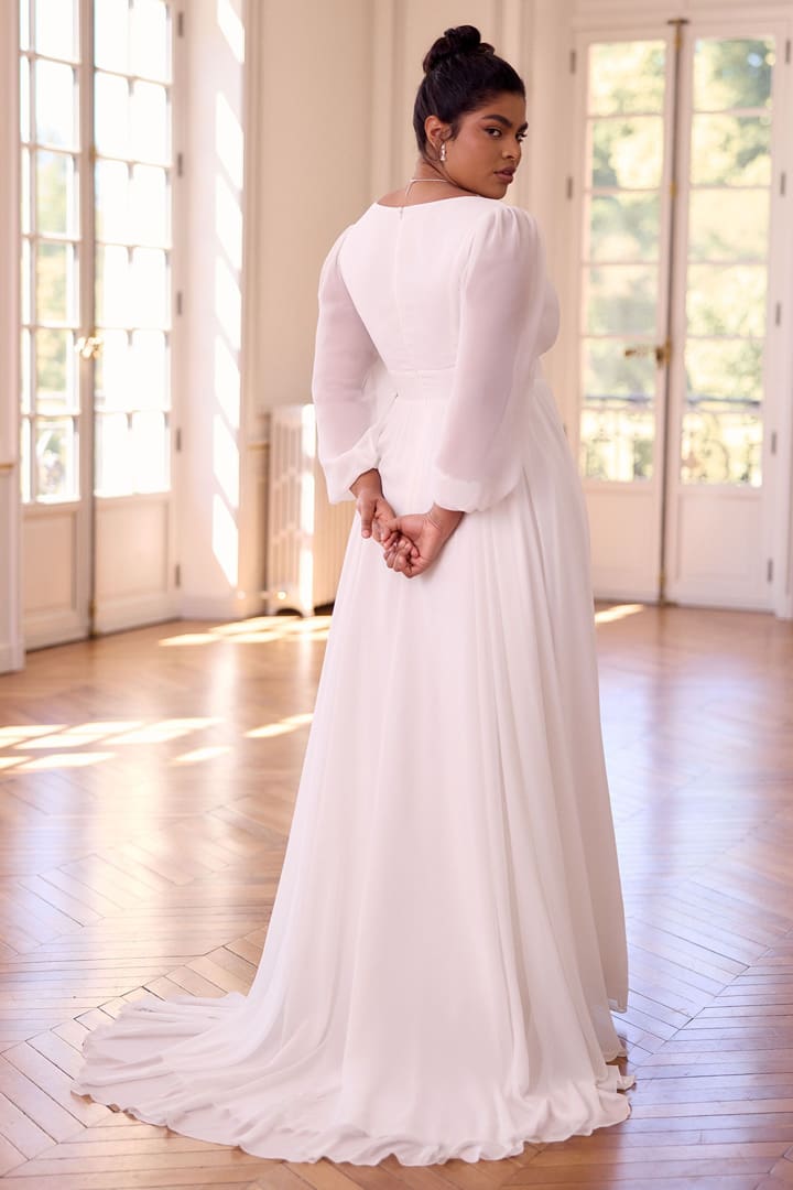 Elegantes Plus Size Brautkleid aus hochwertigem Chiffon gefertigt mit Schleppe und einem raffinierten Beinschlitz. Das Brautkleid Juliana hat lange Bischofsärmel mit Gummizug an den Manschetten, die dem schlichten Brautkleid ein unvergessliches Aussehen verleihen. Dank dem bedeckten Rücken kann man das Kleid mit einem BH tragen.
