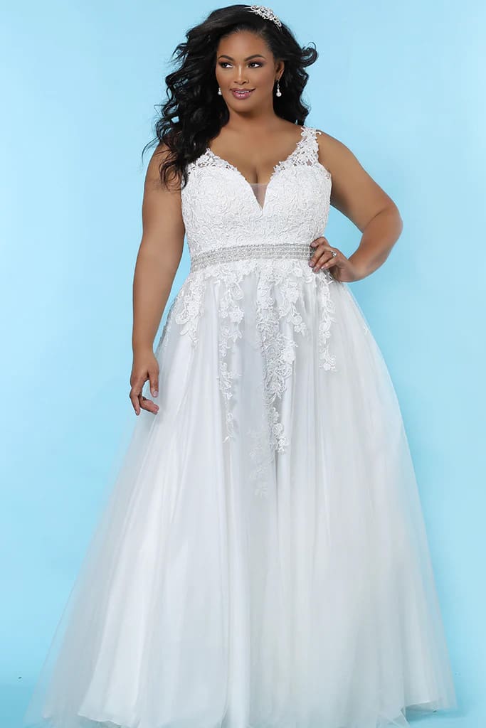 Romantisches Plus Size Brautkleid mit Blumenspitze und einem schlichten A-Linie-Design. Das Brautkleid hat einen zauberhaften handbestickten Gürtel, der gekonnt die Kurven betont. Der tiefe V-Ausschnitt gibt dem Brautkleid einen modernen Touch. Die Spitzenapplikationen mit den transparenten Pailletten verleihen dem Oberteil und dem Tüllrock einen Hauch von Glamour.