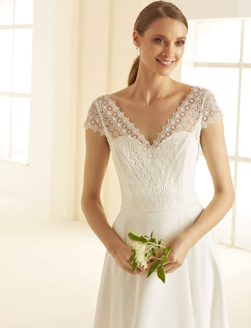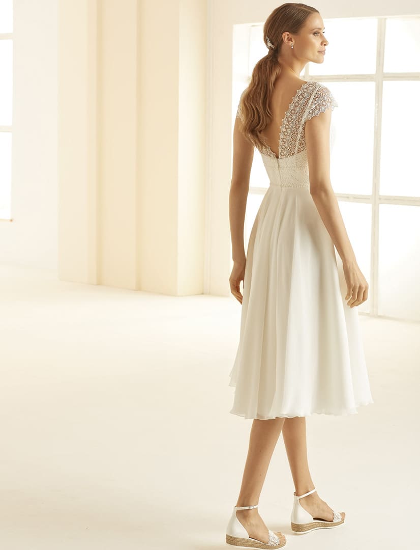 Bornea ist ein romantisches Standesamtkleid in kurz aus hochwertiger Spitze und Chiffon. Der Rock ist leicht und fliessend. Das Kleid hat einen tiefen V-Ausschnitt am Rücken.