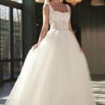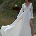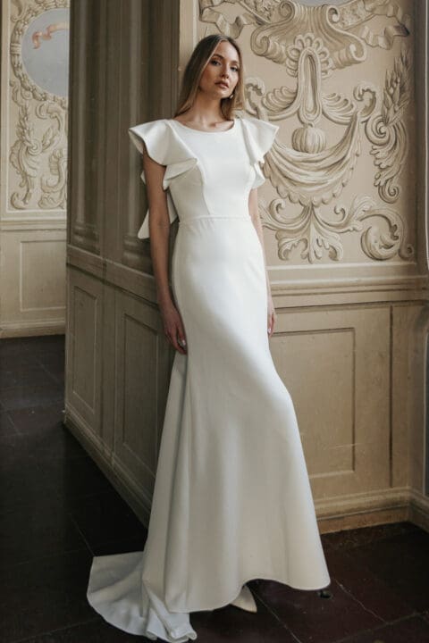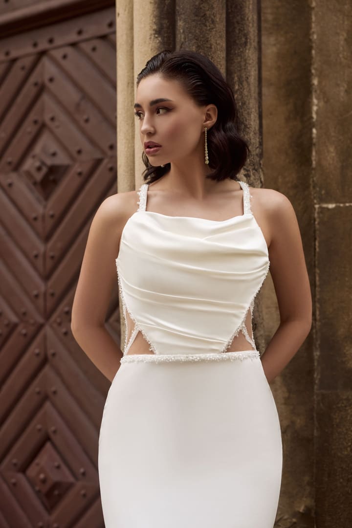 Schlichtes Brautkleid mit einer engen Schnittführung. Die seitlichen Cut-Outs geben dem schlichten Brautoutfit ein spezielles Aussehen. Das Oberteil ist gerade und hat raffinierte Drapierungen. Das Brautkleid hat eine lange Schleppe.