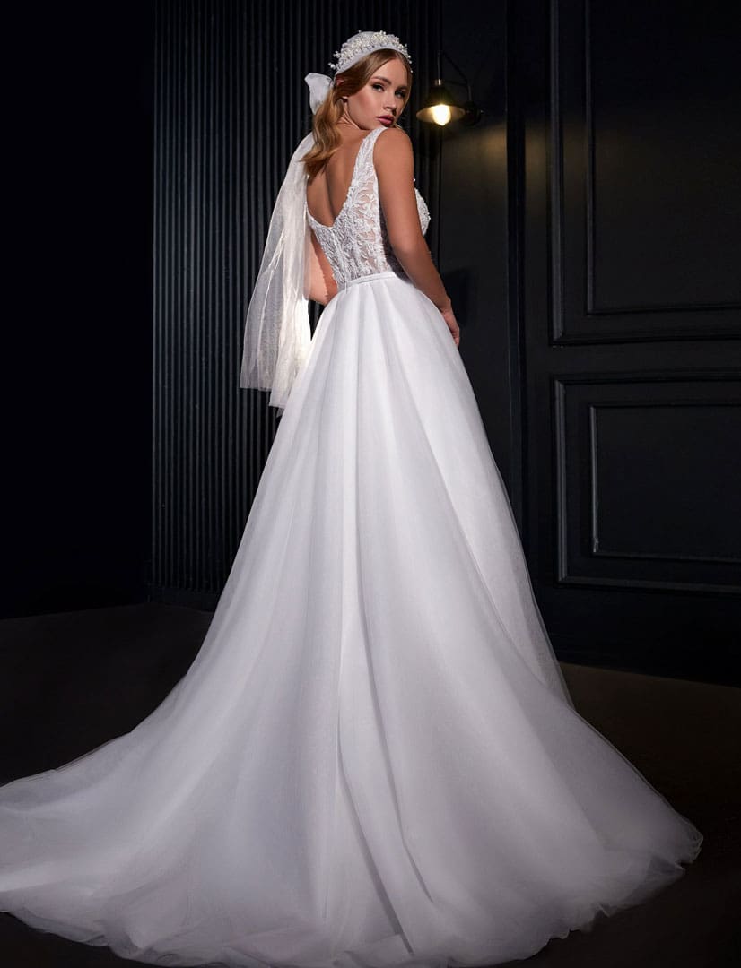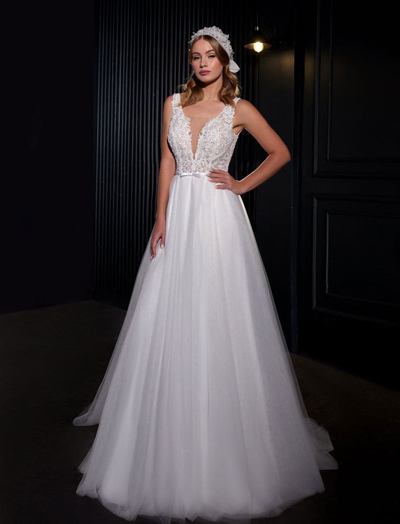 Luftig leichtes Brautkleid mit einem Tüllrock und einer langen Schleppe. Das Oberteil hat Träger, viele Glitzersteine und einen tiefen V-Ausschnitt. Das Oberteil wurde mit einem schmalen Satingürtel verziert, welcher die weibliche Taille hervorhebt.