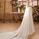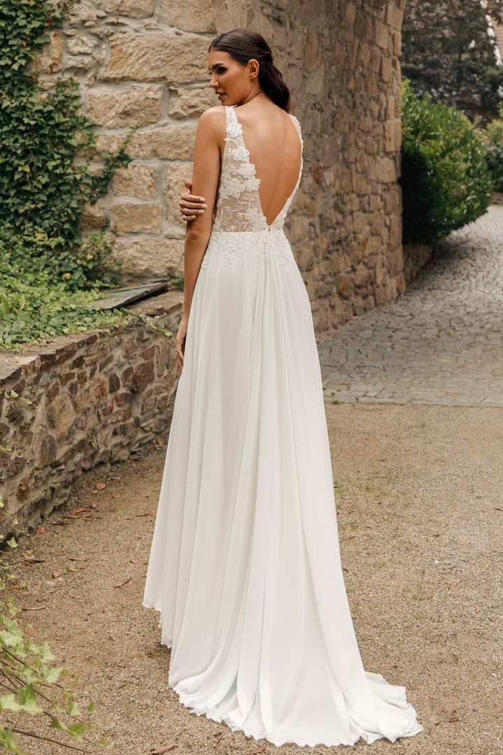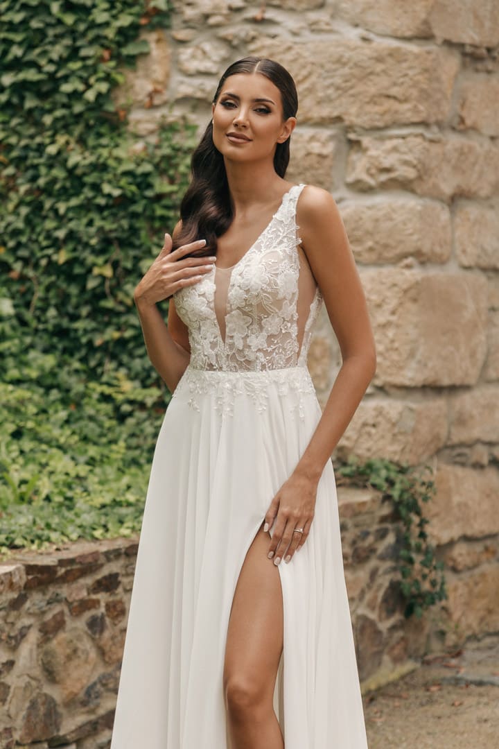 Romantisches Brautkleid mit einer blumenverzierten zarten Spitzenapplikation. Das Oberteil hat einen tiefen V-Ausschnitt und seitliche Cut-outs. Der leicht fallende Chiffonrock mit Beinschlitz ist mit einer Schleppe ausgestattet. Optional ist das Brautkleid auch ohne Beinschlitz erhältlich.