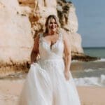 Romantisches Brautkleid mit einem weiten Tüllrock und Carmenträger. Das Oberteil ist mit einer zauberhaften Spitzenapplikation versehen. Die Spitze ist bis zur Hälfte im Rock appliziert. Die lange Schleppe und die Knopfleiste mit satinierten Knöpfen sind weitere Highlights bei diesem eleganten Brautkleid.