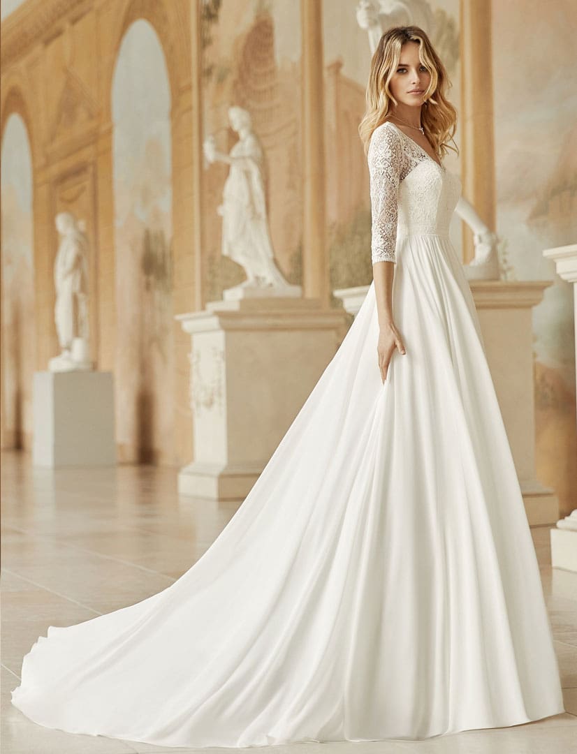 Medusa ist ein klassisches Brautkleid hergestellt mit einer wunderschönen Spitze und einem fliessenden Chiffonrock. Das Kleid hat 3/4-Ärmel und einen V-Ausschnitt. Die lange Schleppe lässt jede Braut atemberaubend aussehen.