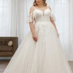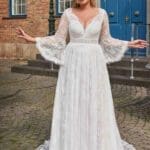 Elegantes Brautkleid mit einem weiten Tüllrock und einem spitzenbesetzten Oberteil. Das Oberteil hat eine Korsage und einen V-Ausschnitt. Die Spitzenärmel zaubern einen romantischen Look. Das Brautkleid Michelle lässt sich am Rücken mit satinierten Knöpfen verschliessen. Die lange Schleppe vollendet den eleganten Brautlook.