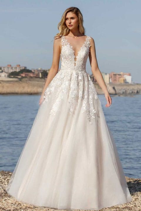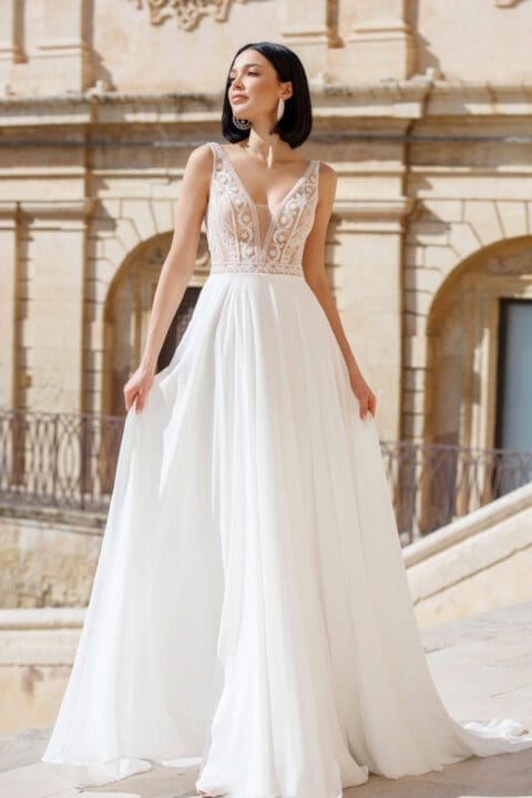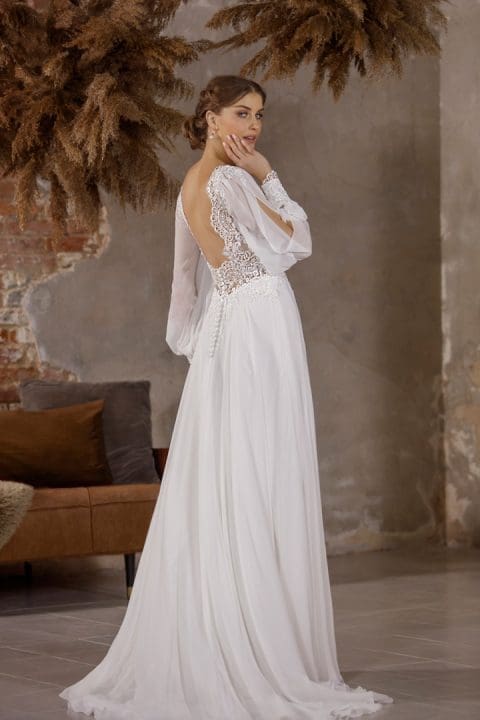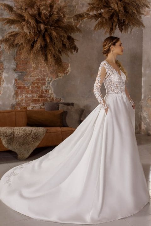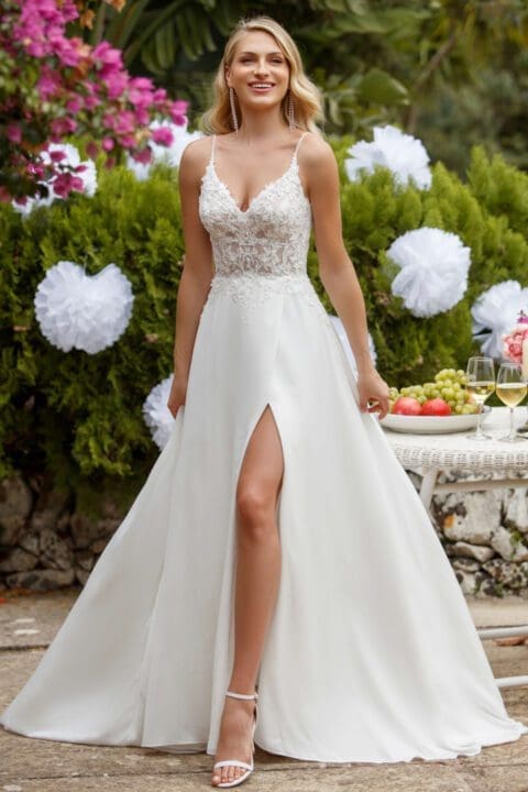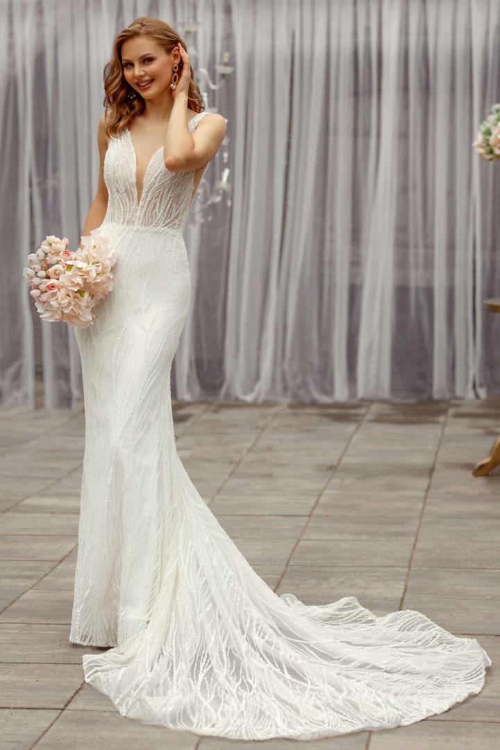 Ein Brautkleid mit dem gewissen Etwas. Das Brautkleid ist mit unzähligen funkelnden Pailletten verziert. Der tiefe Ausschnitt vorne macht eine schöne Silhoutte. Der offene Rücken bei diesem Fit n Flare Brautkleid gibt den richtigen WOW-Effekt. Ein tolles Kleid für alle Bräute, die ein aussergewöhnliches Brautoutfit suchen.