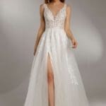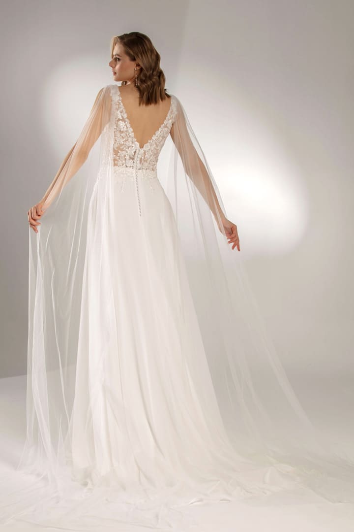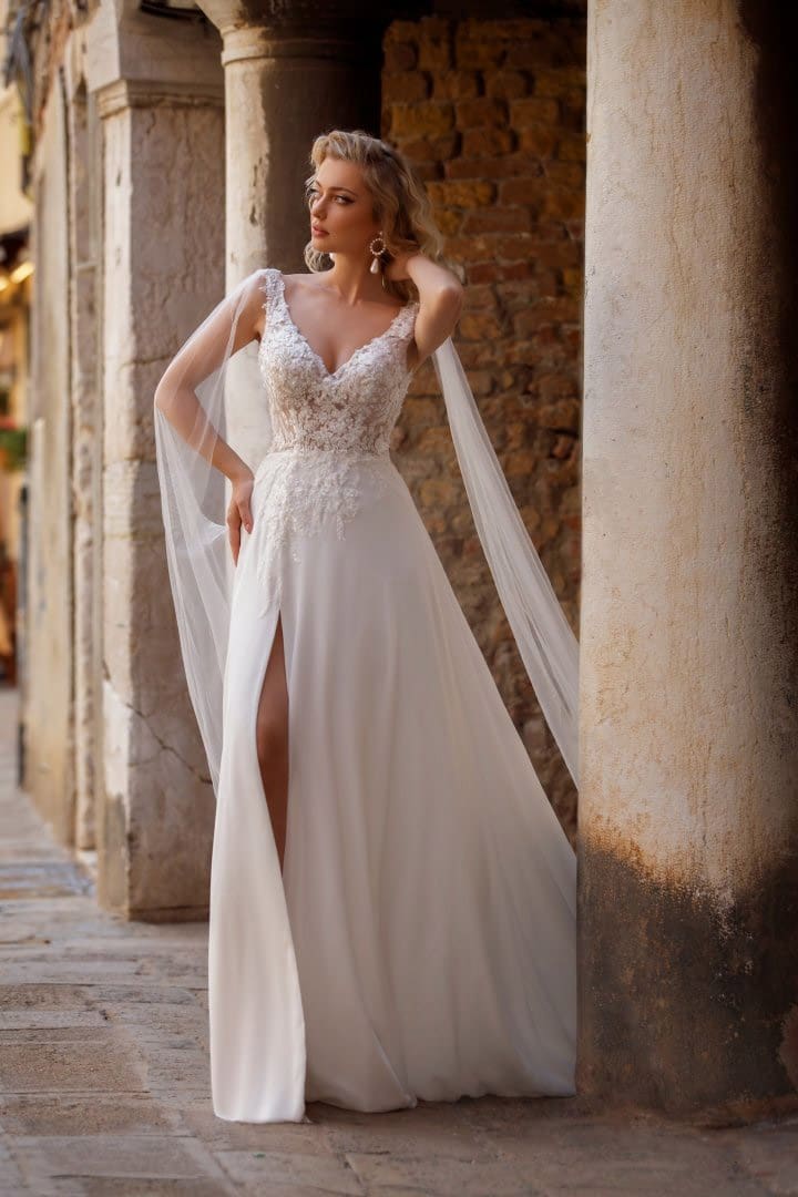 Romantisches Brautkleid mit einem leicht fallenden Chiffonrock mit Beinschlitz. Der tiefe V-Ausschnitt mit den satinierten Knöpfen am Rücken gibt ein anmutiges Aussehen. Die blumenverzierte Spitze fliesst in den Rock. Das Oberteil hat breite Träger.