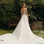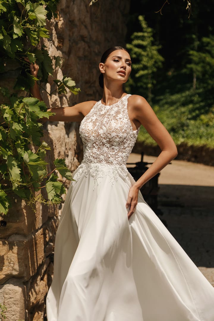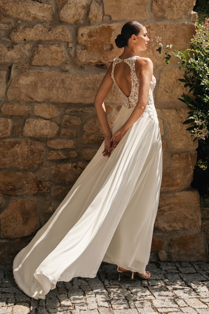 Modernes Brautkleid hochgeschlossen mit einem raffinierten Rückenausschnitt. Eine blumenverzierte Glitzerapplikation lässt das Oberteil besonders schön aussehen. Das Brautkleid Nora bietet modernsten Stil und klassische Schönheit. Erlebe die Magie dieses besonderen Brautkleides mit einem luftig leichten Chiffonrock.