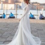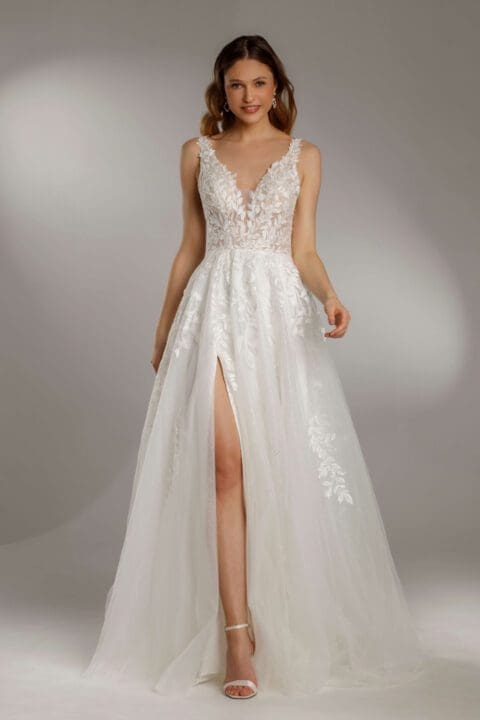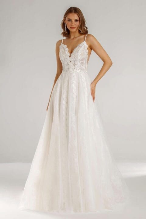Zauberhaft schönes Brautkleid im klassischen Stil mit einer spitzenbesetzten Korsage. Das Brautkleid mit V-Ausschnitt hat dünne Träger und eine lange Schleppe. Die Spitze läuft verspielt in den Rock.