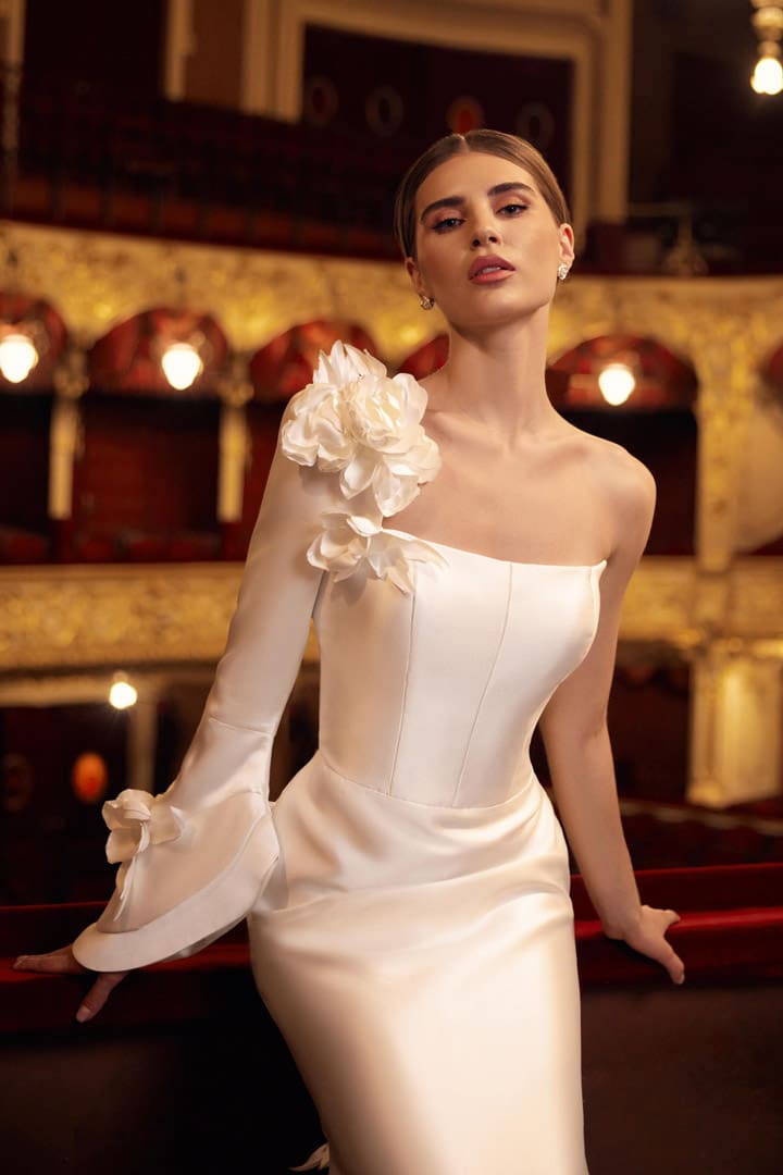 Atemberaubendes Brautkleid aus Mikado Satin. Das Brautkleid mit der engen Schnittführung hat eine gerade Korsagenform. Eine Armseite wird bedeckt mit einem langen Ärmel. Verziert ist der Ärmel wie auch die Schleppe mit grossen Blüten. Ein extravagantes Brautkleid für eine aussergewöhnliche Braut.