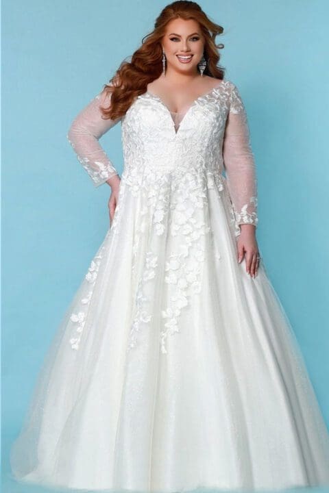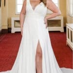 Ein wunderschönes Brautkleid für grosse Grössen aus Mikado Satin, schlicht gehalten, mit einer atemberaubenden floralen Spitzenapplikation am Ende der Schleppe. Dieses Designelement verleiht Ihrem stilvollen Look eine romantische Note.